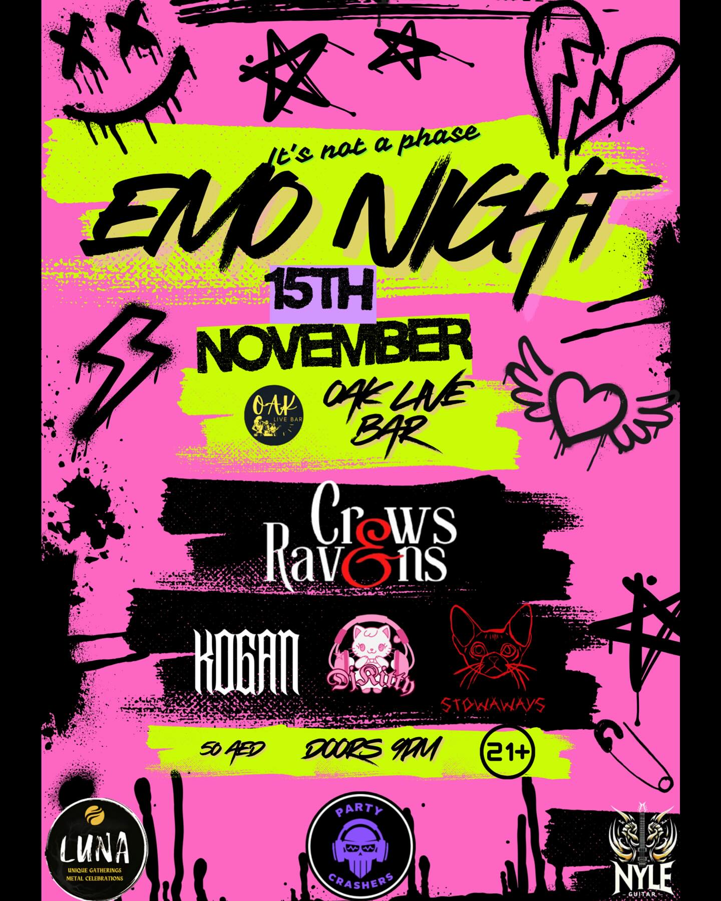 Emo Night is back January 31st @oaklivebar_official. We have three Emo live bands performing for you ๐ฅ: @crowsandravensuae, @kogantheband , @theblankuae. Plus we have @djkitty666 spinning Emo bangers ๐ค And @aboufool will be starting the night with Emo tunes as well ๐ค๐ป You don't wanna miss this stacked line up ๐ธ๐ต
