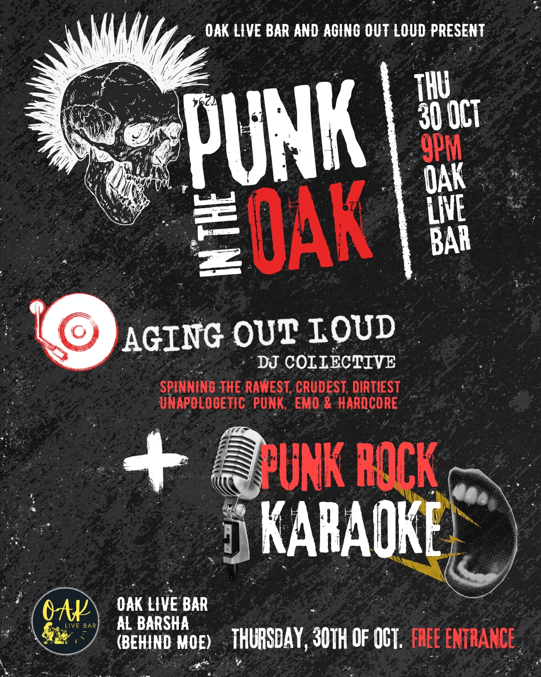 PUNK IN THE OAK IS BACK! ๐ธ Get ready for a Halloween Punk Party like no other โ happening October 30th at Oak Live Bar! ๐งท Sing. Scream. Shred. Itโs Punk Rock Karaoke night โ come dressed as your favorite punk legend and take the stage!