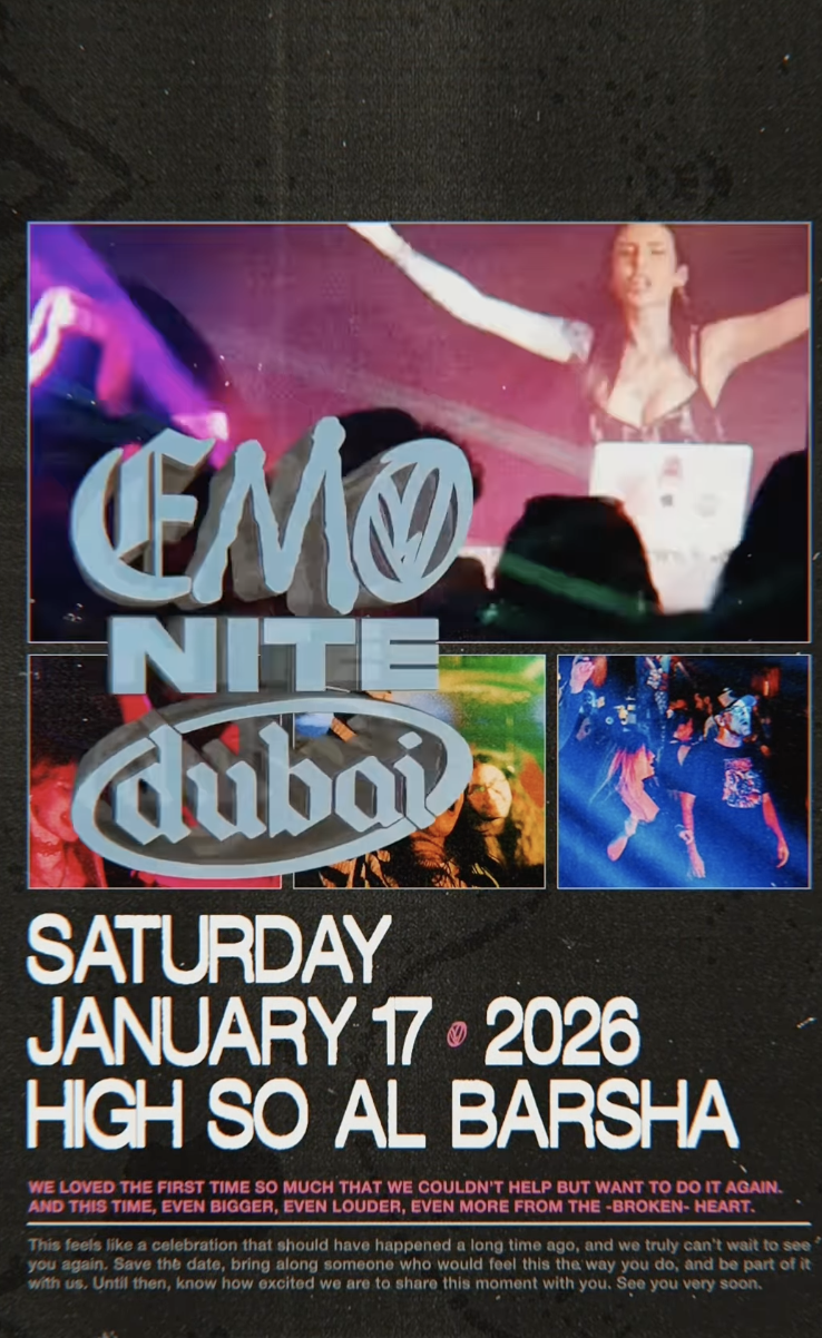 โWe did it once. Now weโre doing it bigger, louder, harder. โEmo Nite Dubai is back for round two. โMore anthems, more chaos, more feelings! Let's start 2026 the right way. โ17th January, High So - Al Barsha. Doors open at 20:00 โAED 50 Entrance fee (includes 1 drink) Tickets only at the doors on the date of the event. +21