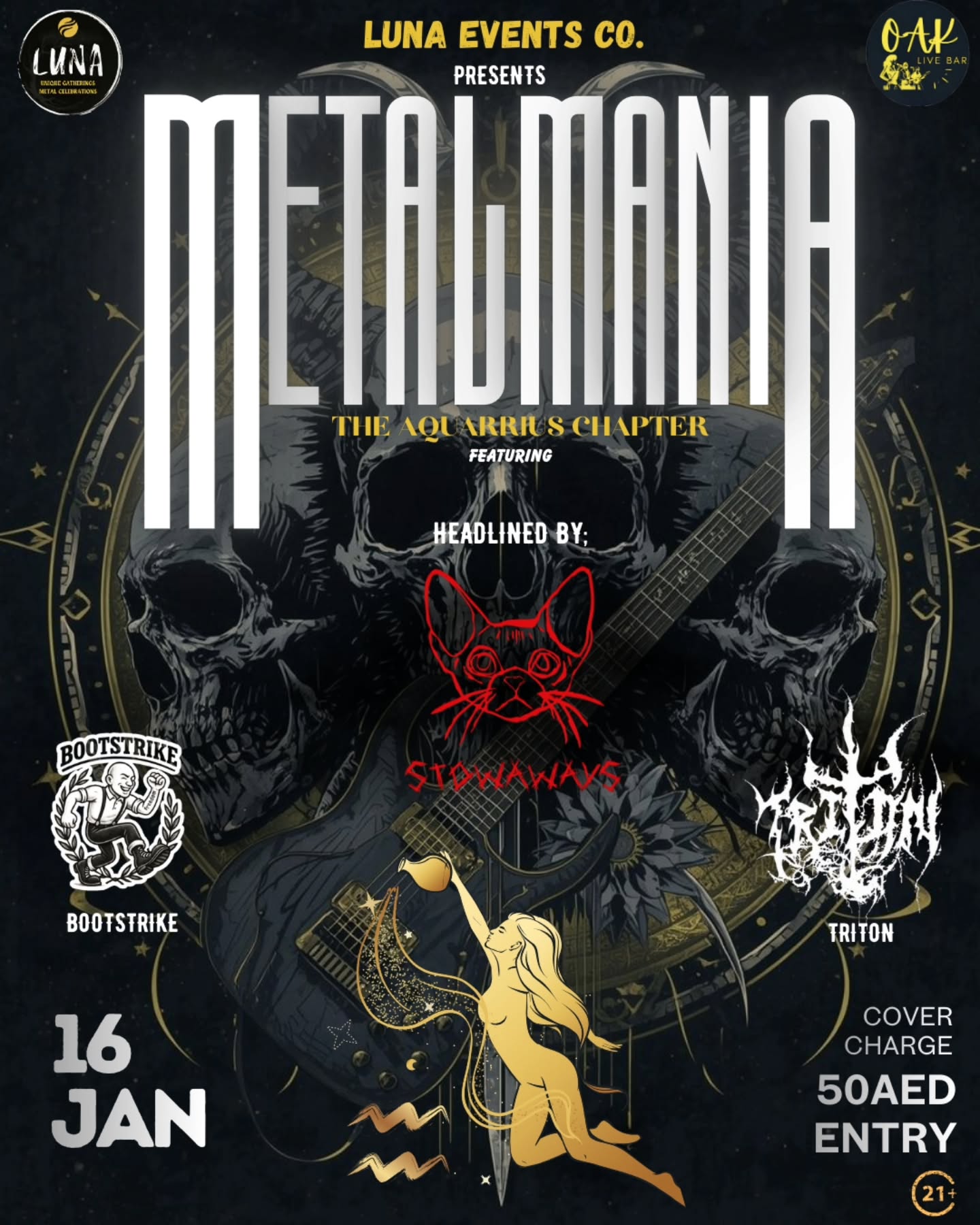 ๐ข GET READY FOR THE FIRST METALMANIA OF 2026 !! THE SAGITTARIUS CHAPTER โ Headlined by: ๐ธ Stowaways Joining the chaos ๐ธ Triton Ban ๐ธ Bootstrike ๐ Jan 16 โข Sat โฐ Doors open at 9P ๐ Venue Partner: Oak Live Bar ๐ Strictly 21+