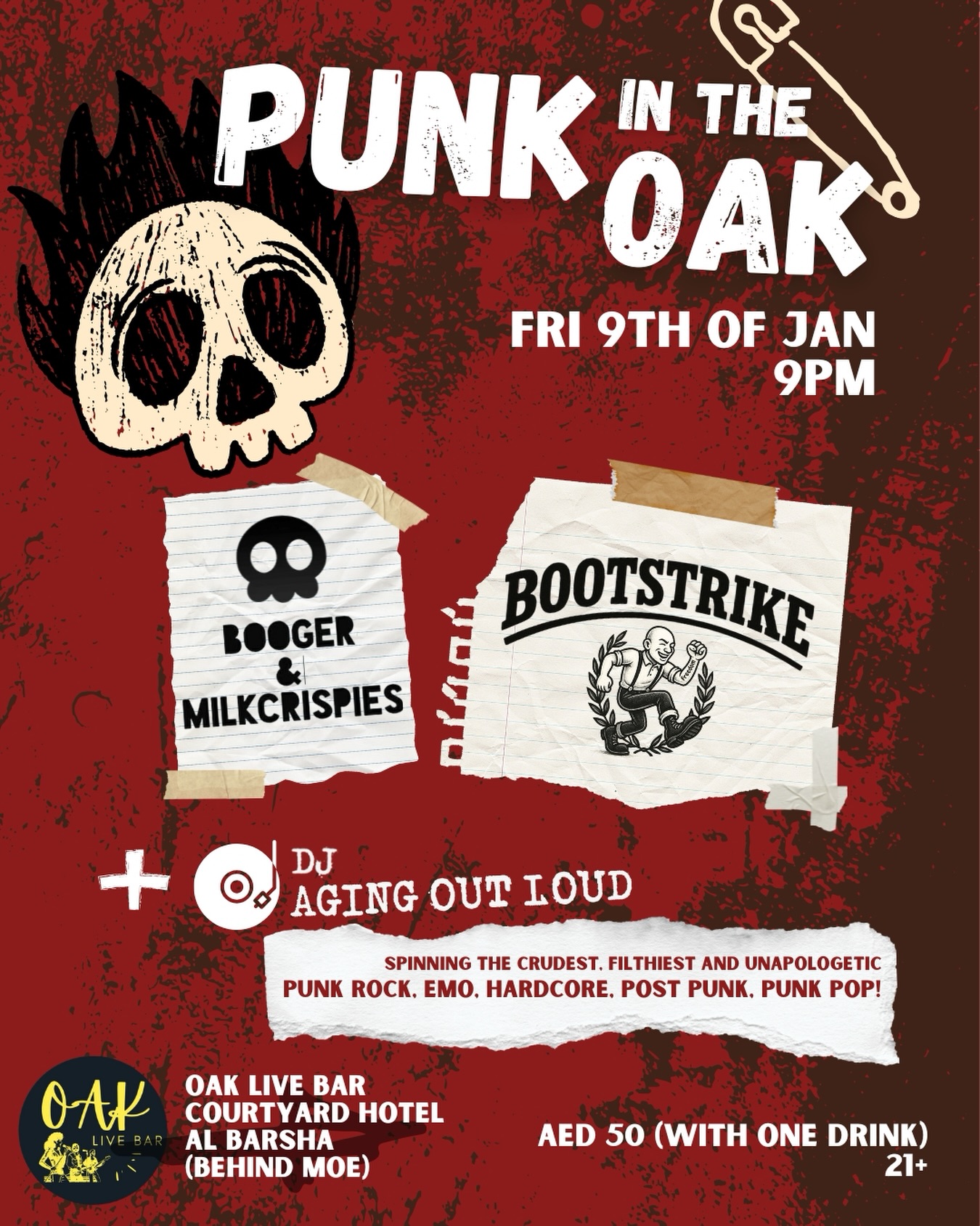 And we are back for the first Punk In The Oak of 2026! And this time with a killer live line up: BOOTSTRIKE and Booger&Milkcrispies will take the stage for the first mosh pit of the year! Come support your local scene @oaklivebar_official on Jan 9th! Entrance: AED50 (with one drink); 21+