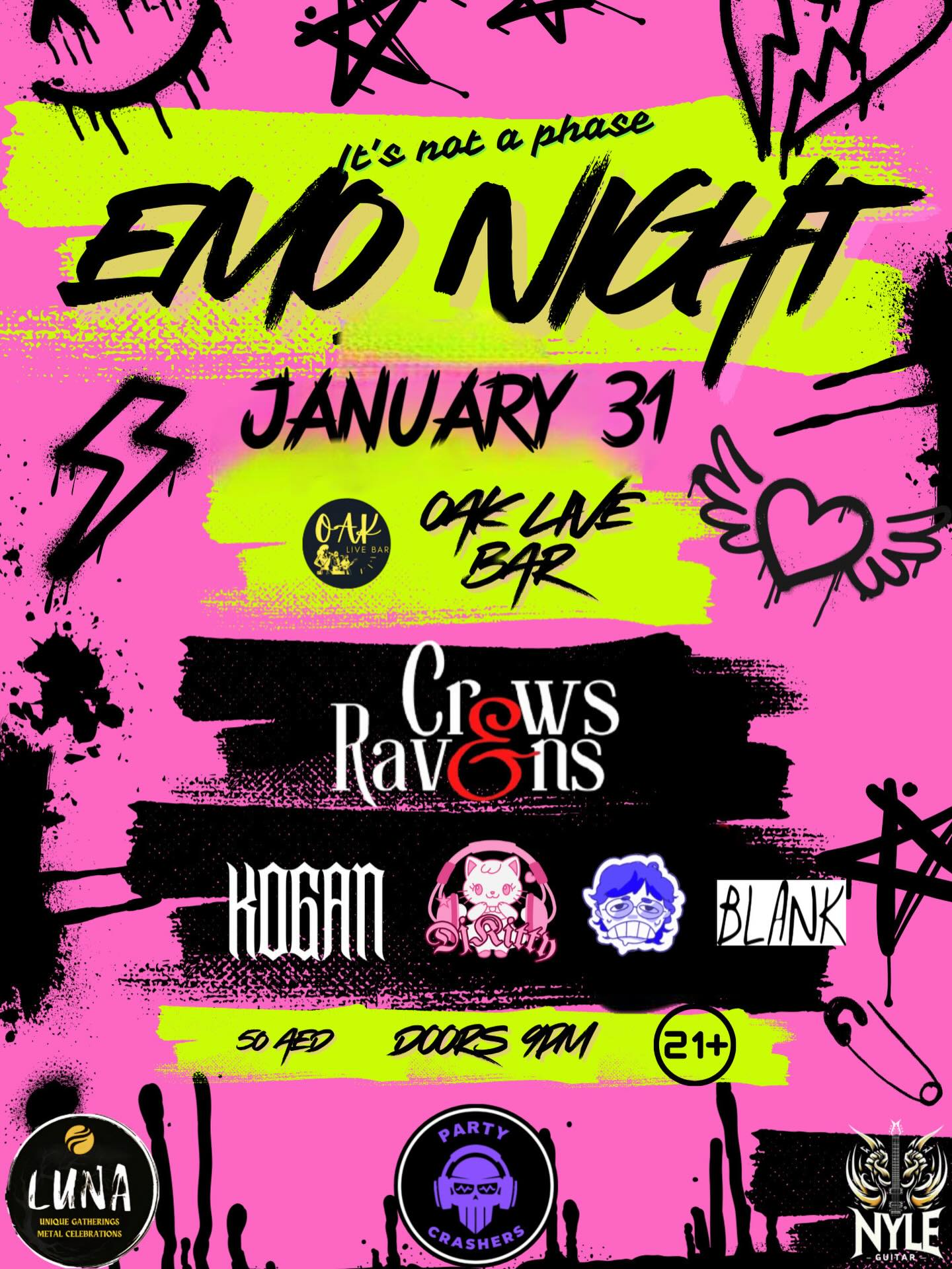 Emo Night is back January 31st @oaklivebar_official. We have three Emo live bands performing for you ๐ฅ: @crowsandravensuae, @kogantheband , @theblankuae. Plus we have @djkitty666 spinning Emo bangers ๐ค And @aboufool will be starting the night with Emo tunes as well ๐ค๐ป You don't wanna miss this stacked line up ๐ธ๐ต