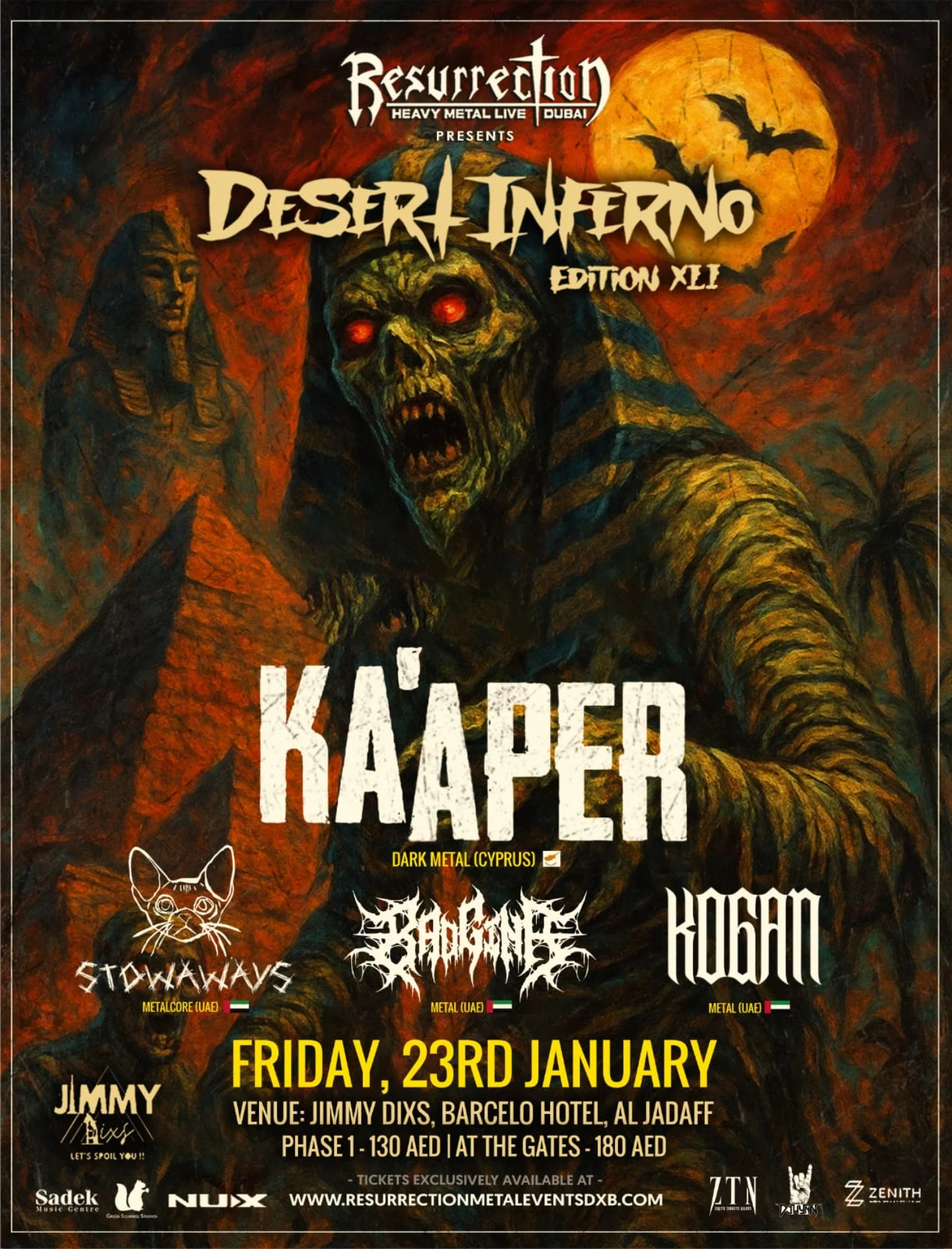 Weโre excited to welcome three killer UAE metal acts to Desert Inferno XLI - ๐คA Resurrection Metal Events Dubai Presentation! ๐ค ๐ธ Kogan โ Metal from UAE ๐ฆ๐ช is a Dubai-based band, theyโve evolved into a high-energy force in the local rock and metal scene,Their live set consists of crowd-igniting heavy covers from My Chemical Romance, Bring Me The Horizon, Linkin Park, Slipknot, and Pierce the Veil.โก Stowaways โ Metalcore (Abu Dhabi / UAE) ๐ฆ๐ช An Abu Dhabi-based metalcore band, known for their high-energy live shows, they bring raw chaos and represent the new wave of heavy music in the local UAE scene. ๐ฅ Bad Gina โ Metal (Dubai) ๐ฆ๐ช A fierce UAE metal act delivering raw, high-intensity heaviness, crushing riffs and pit-igniting breakdowns. Their single Redrum captures their chaotic energy and brutal live impact perfectly. ๐ค๐ฅ ๐ Friday, 23rd January 2026 ๐ Jimmy Dixโs, Barcelo Hotel Al Jaddaf, Dubai ๐ฆ๐ช ๐ค Headliner: Kaโaper (Cyprus)